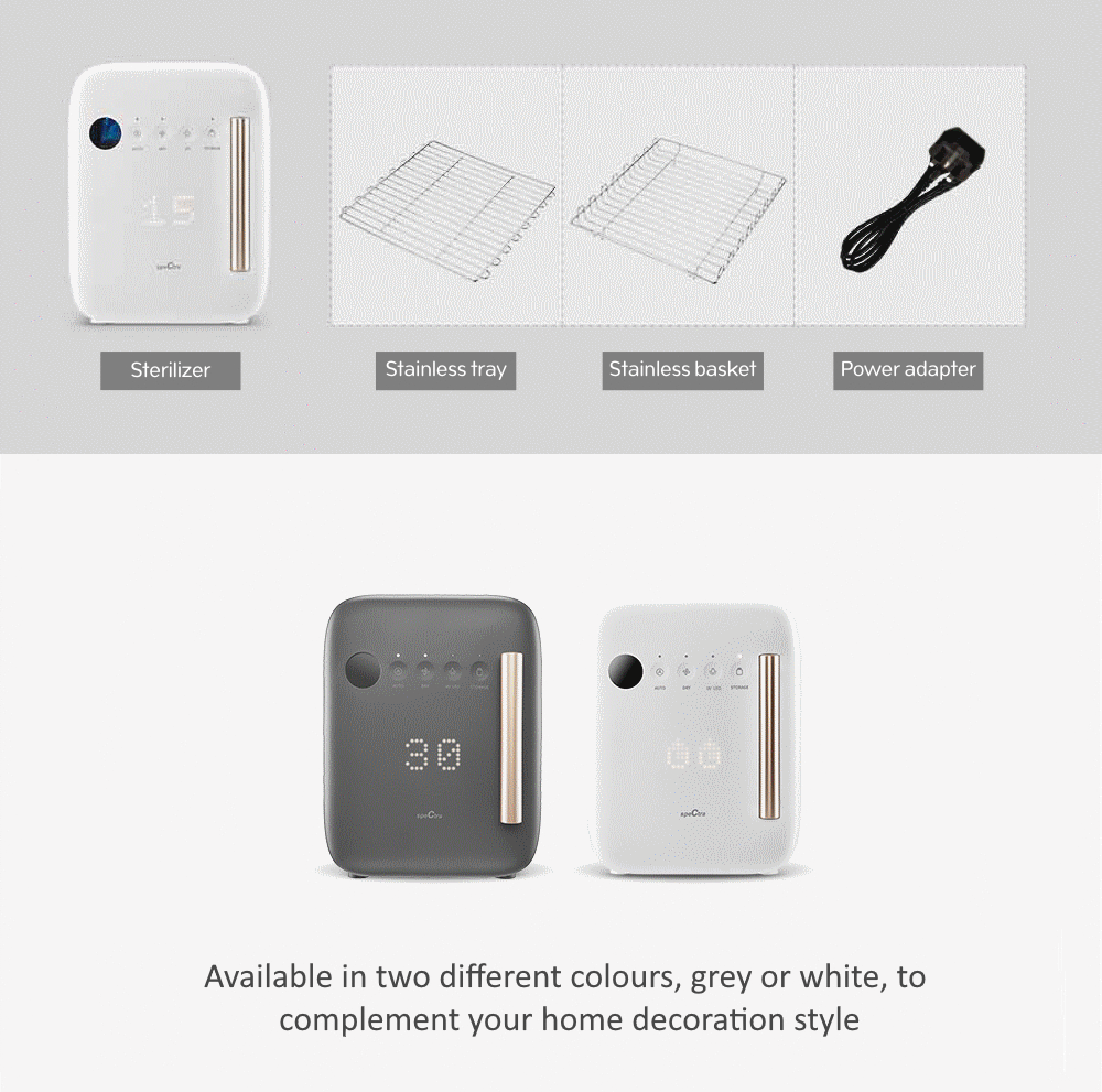 • What's included: UV-LED Sterilizer x 1pc, SUS304 Stainless shelf x 1pc, SUS304 Stainless basket x 1pc, Power Supply Adapter x 1