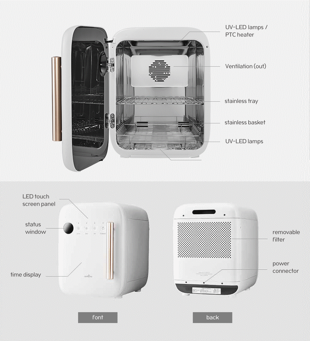 • Drying / sterilization method: built-in PTC low-temperature thermostat heater/ UV-LED ultraviolet lamp