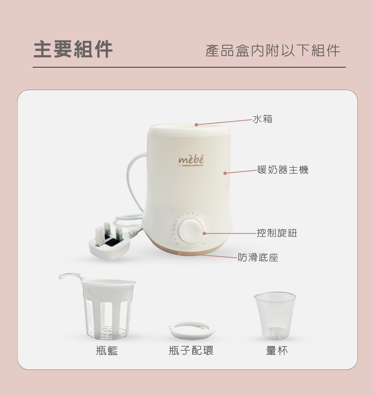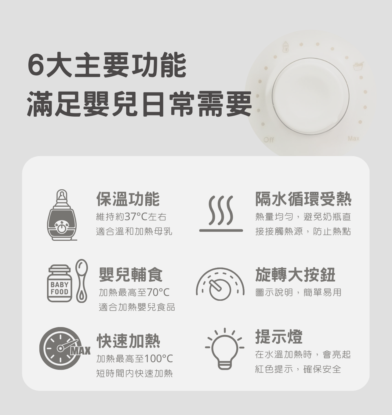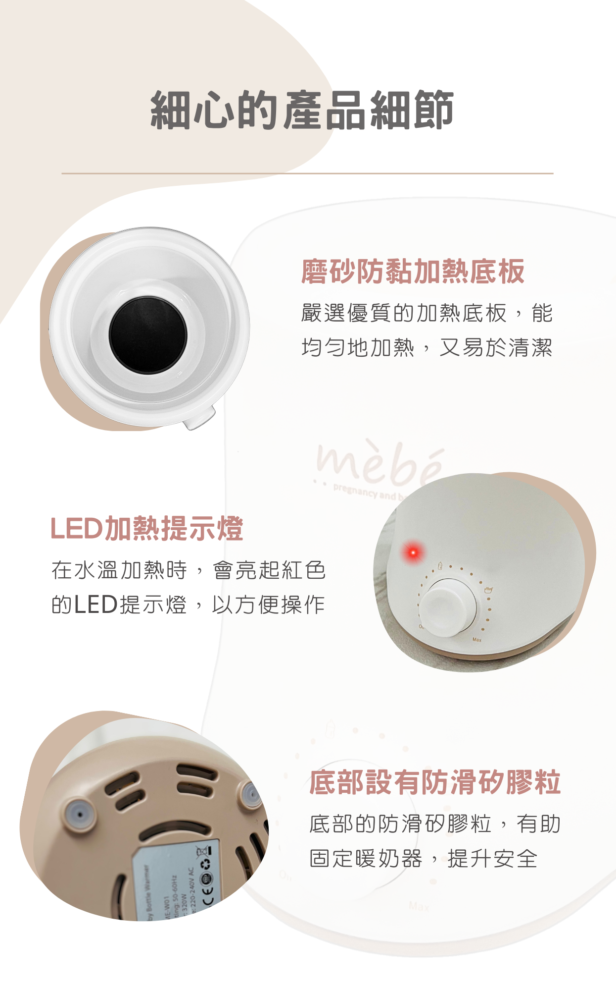 新推出的 mèbé 多功能暖奶器,只有一個控制旋鈕,操作簡易。 內置三種不同加熱模式,恆溫設計,能保持水溫,又能避免過度加熱,讓您可以快速、安全地加熱母乳、奶瓶和各類嬰兒輔食飲料,更可以節能的方式持續保持溫暖,以滿足寶寶的日常需要。