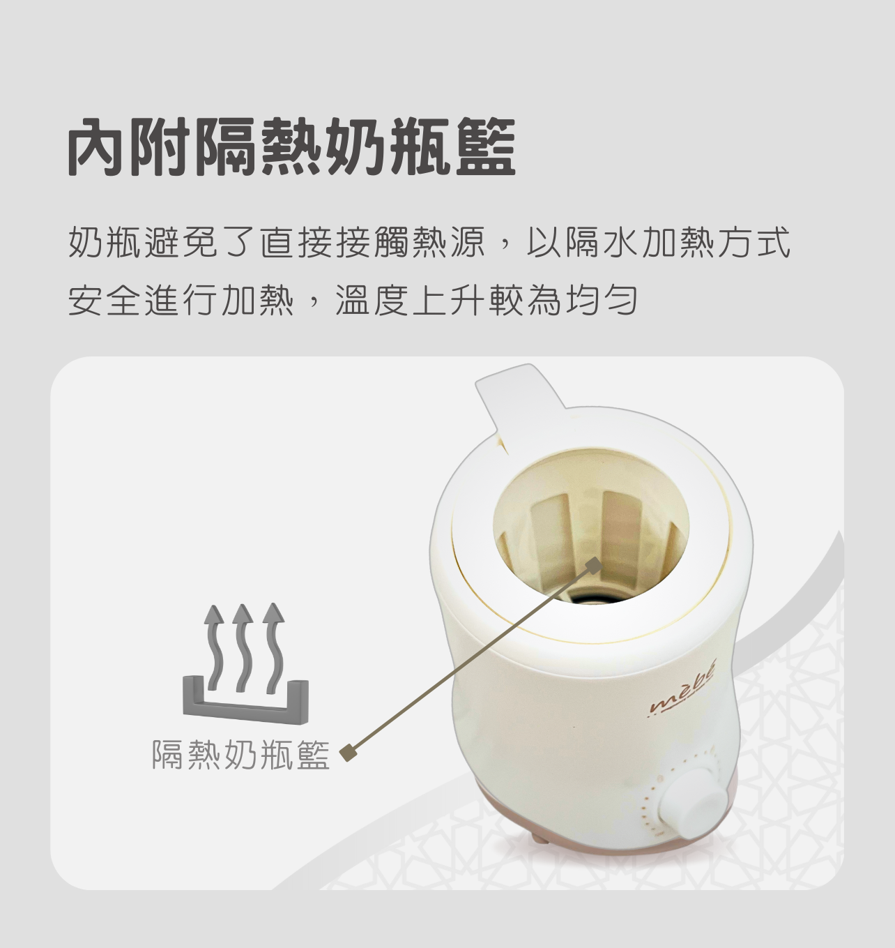 以隔水式水浴溫和均勻地加熱,有效防止熱點,是您理想的暖奶器,可保存母乳中的營養成分和抗體