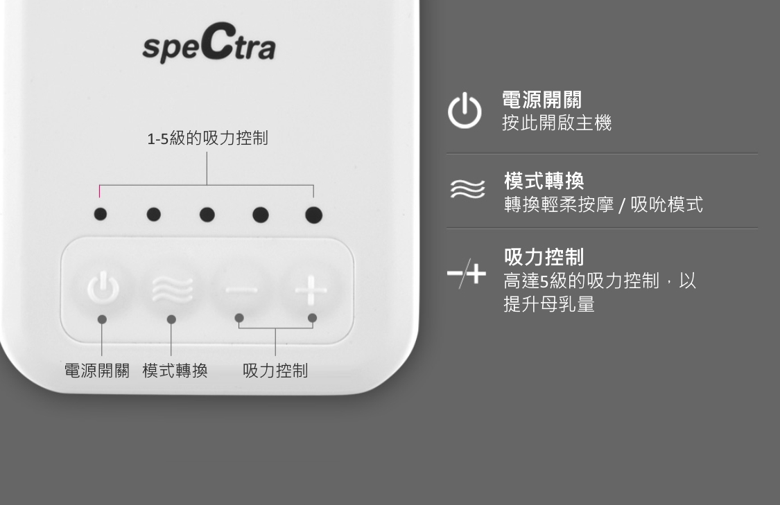 設有輕柔按摩功能及5級吸吮模式,模仿嬰兒吸吮節奏,可調節不同的泵力,以提升母乳量