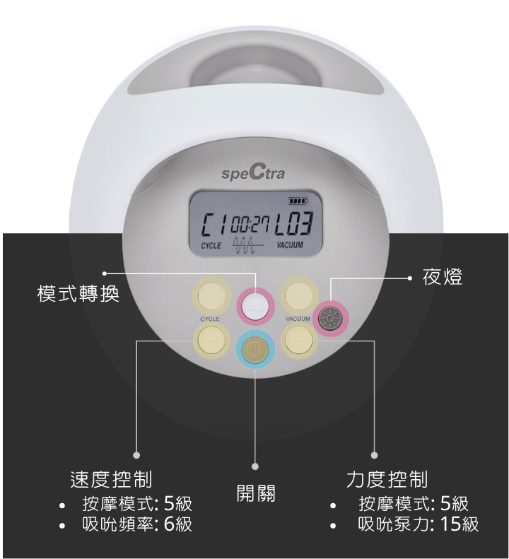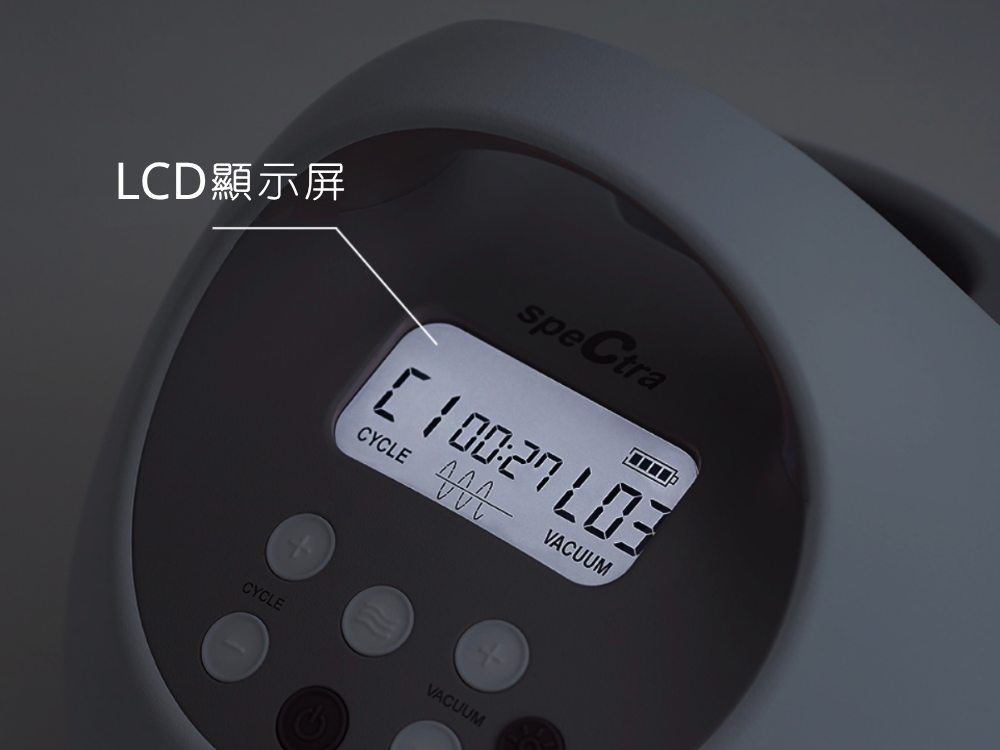 全新的背光LCD顯示屏,儘管於晚上使用,也能清楚顯示各項奶泵的資料,並可以按個人需要輕鬆調節奶泵的左右吸力、按摩功能的強度和吸吮的頻率等,功能卓越且多樣化。