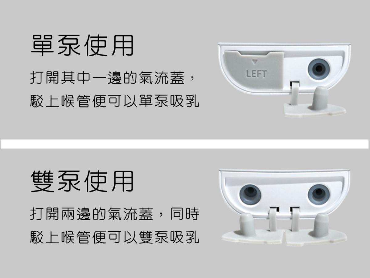 打開機身下方的氣流蓋,簡單增加或減少喉管的數量,即可轉換為單泵或雙泵使用,能有效地配合母乳媽媽在不同情況下的需要。以雙泵使用時,可調高奶泵的力度,有助維持最佳的泵母乳效果