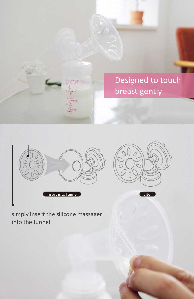 - 獨特的軟墊設計,能輕柔按摩乳房,以刺激母乳流出及提升流量